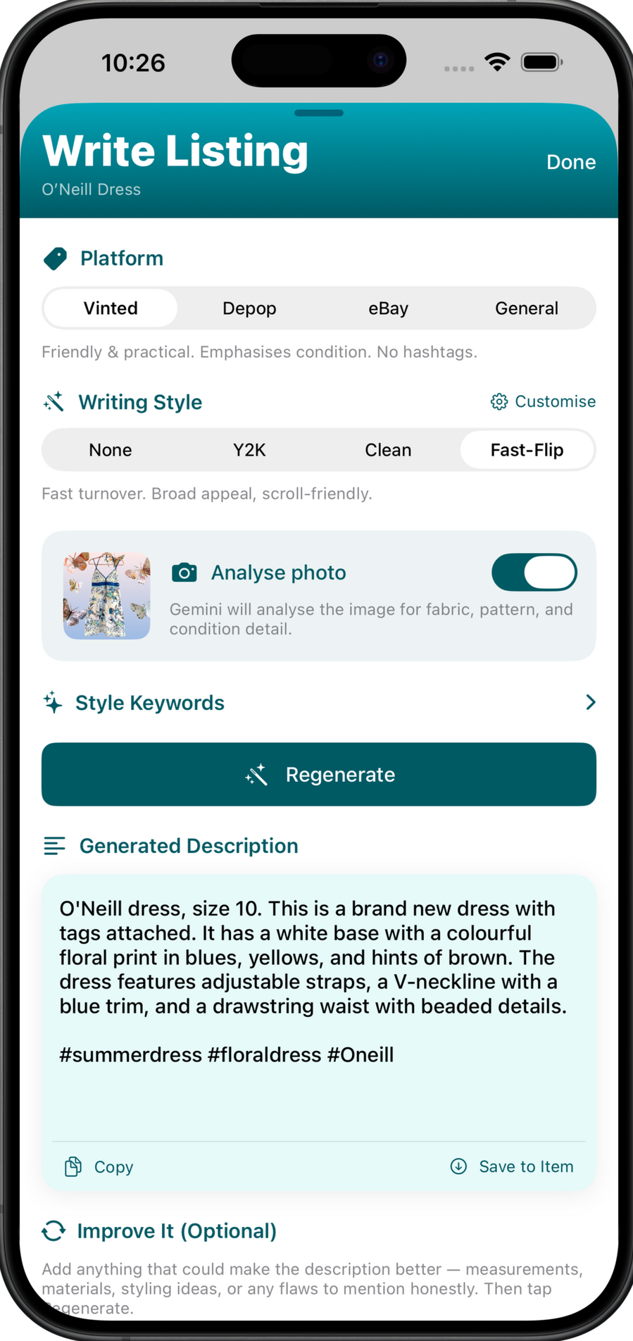 Tap once and get a ready-to-paste description for Vinted, Depop or eBay. Your style, your voice, in seconds.