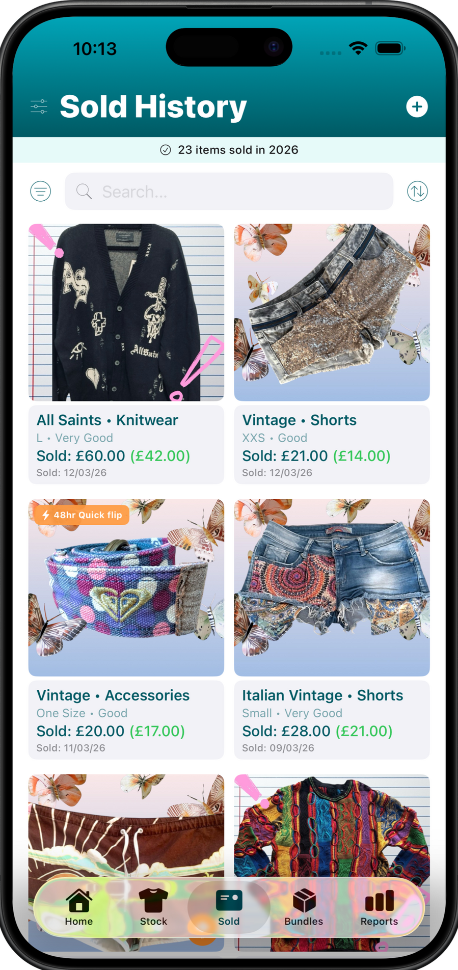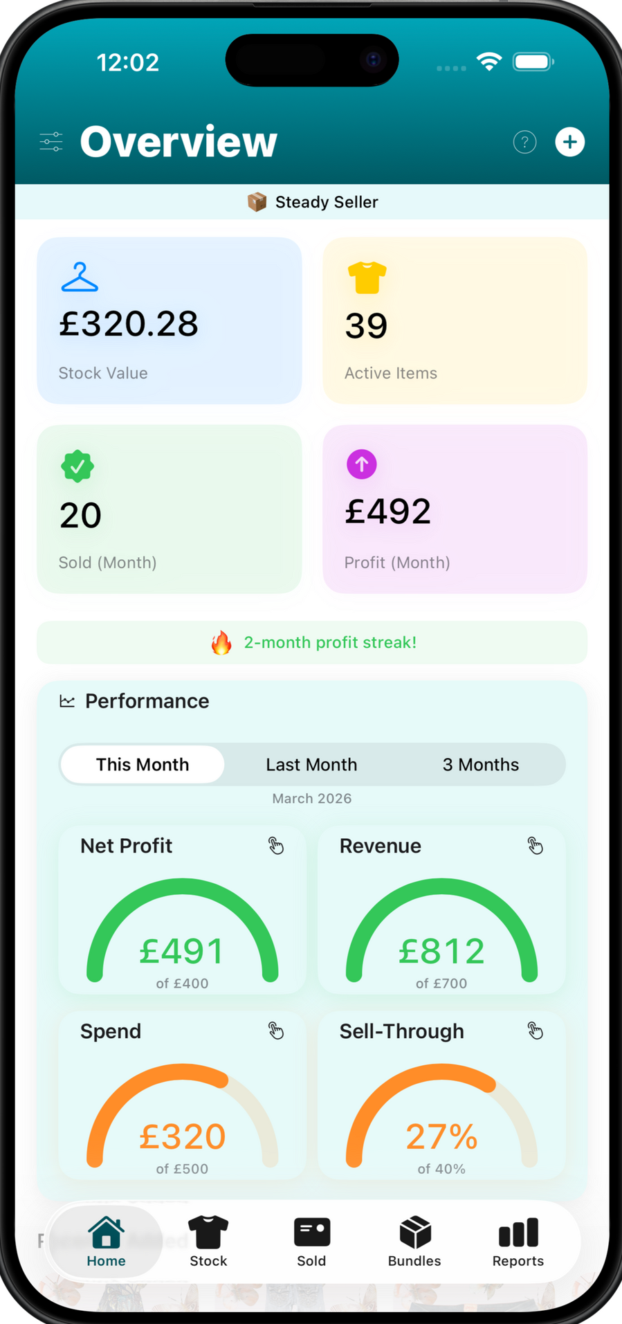 Resellr is a free inventory and profit tracking app for UK clothing resellers selling on Vinted, Depop, eBay and Whatnot. Track stock, manage bundles, and generate AI listing descriptions — all from your iPhone.