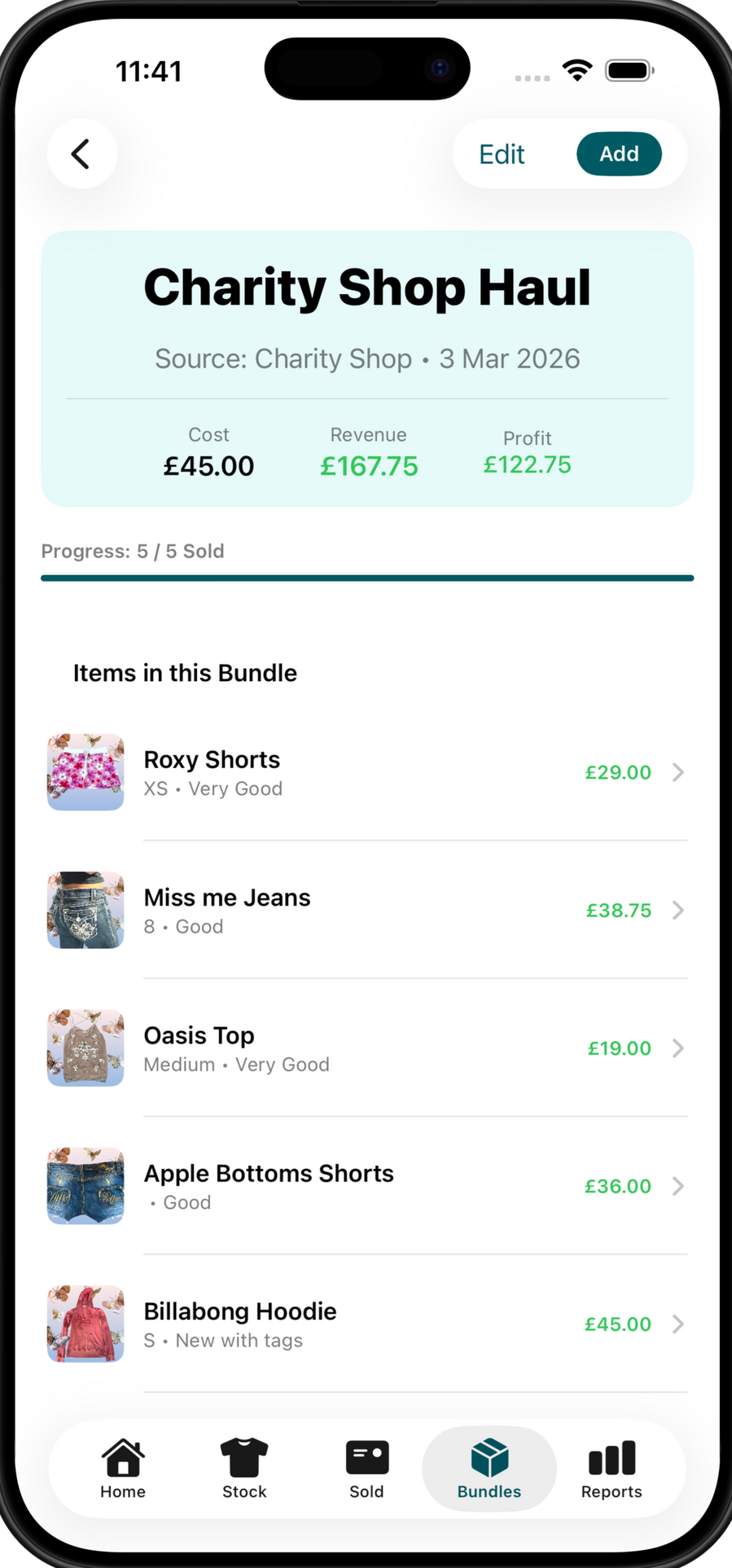 Bought a bag for £20? See your profit grow with every item you sell. Auctions, bales, job lots or car boot hauls Resellr tracks the return on the whole lot.